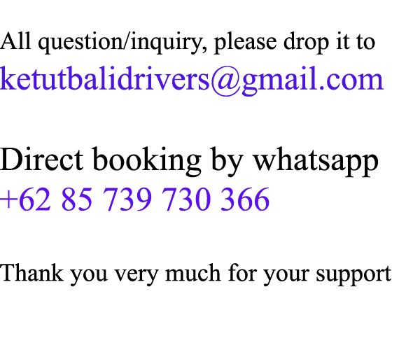 Please drop an email to info@ketutbalidrivers.com for inquiry, question, request special rate and booking. WHATSAPP +62 85739730366